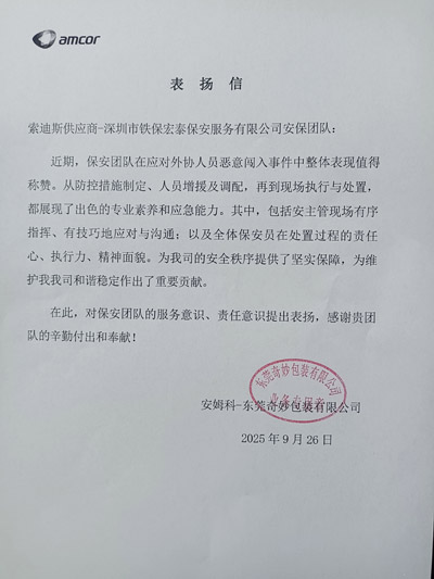 安姆科-東莞奇妙包裝有限公司致信表揚我司鐵保宏泰深圳保安公司安保團隊在應(yīng)對外協(xié)人員惡意闖入事件中整體表現(xiàn)值得稱贊,為客戶公司的安全秩序提供了堅實保障,極大維護了公司的和諧穩(wěn)定作出了重要貢獻。